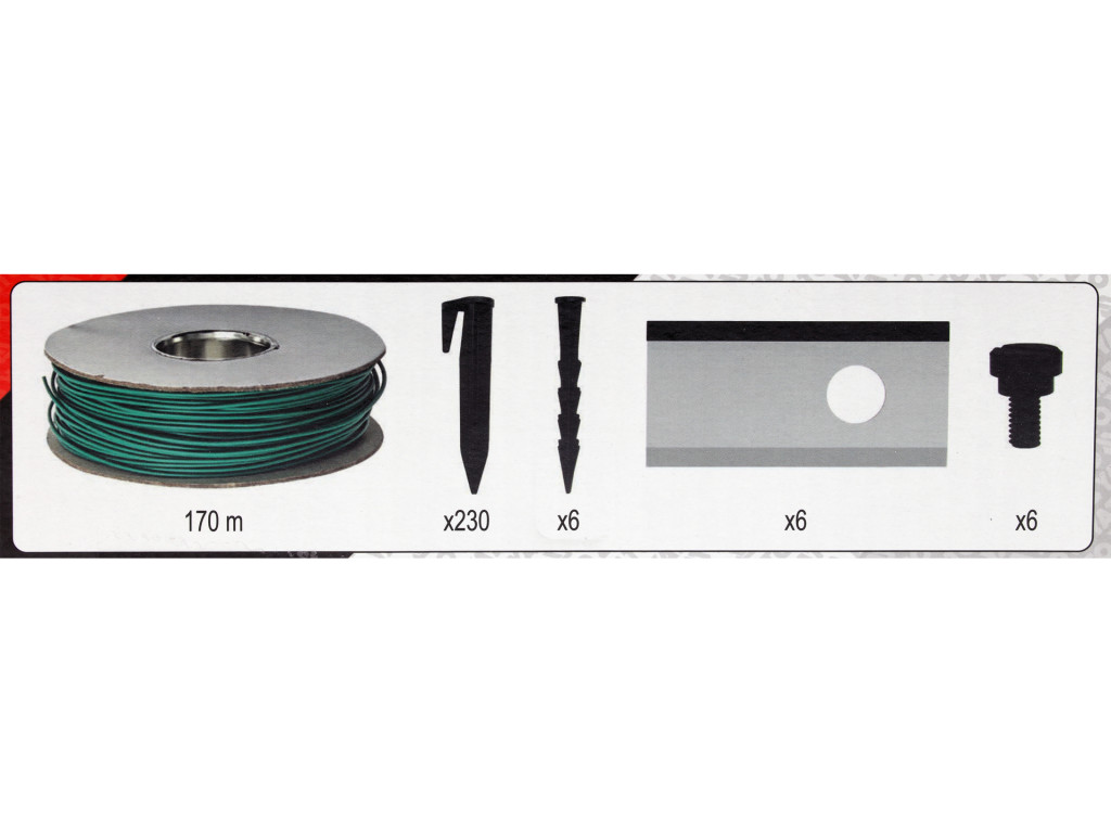 robot, töltőállomás, töltő, 170 m határolóvezeték, 230 db rögzítőcsap, 6 db rögzítőszeg, 9 db kés (3 db előre telepítve), 9 db pengecsavar (3 db gyárilag beszerelve), Védettségi fok: IPX5 (robot), IP67 (töltőállomás)